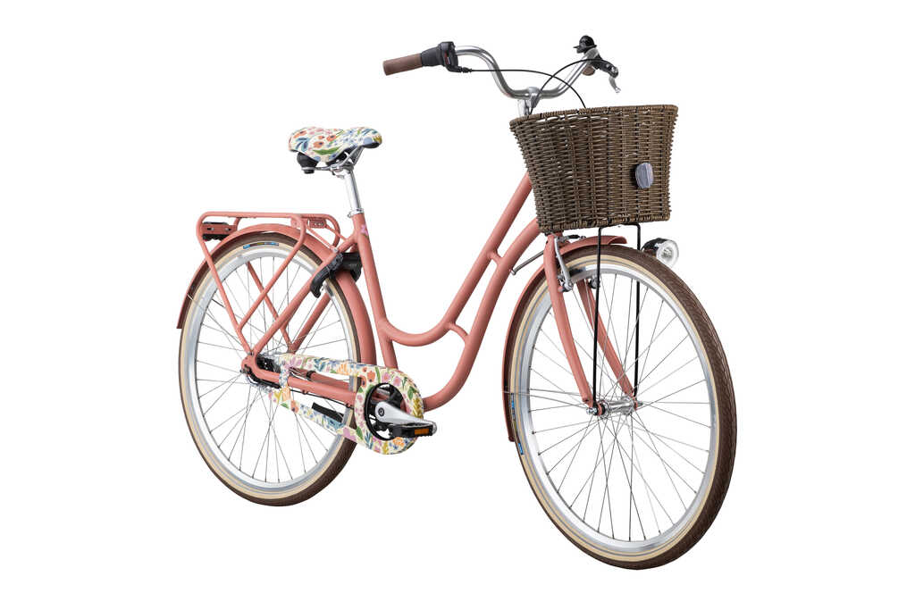 Blommönstrad sadel och kedjeskydd för tankarna till kända inredningsklassiker och bärs upp av en ram i en nedtonad gammelrosa. Matchande däck, handtag och en brun fast monterad korg i konstrotting skapar en elcykel som är något alldeles extra.