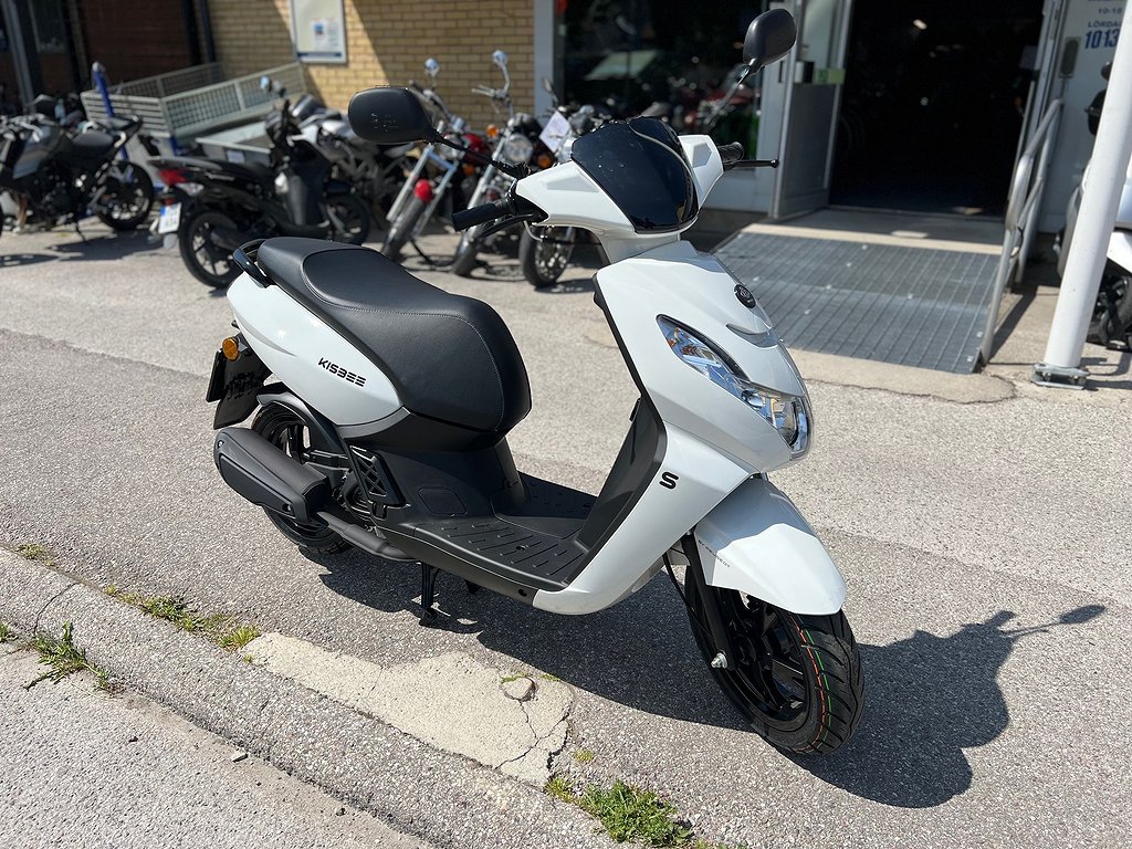 Peugeot Kisbee har mycket goda fo?rvaringsmo?jligheter och ett plant golv. Sadelhöjden är 770 mm och har en upprätt körställning som ger dig en stabil och säker körställning med mycket god överblick av dina medtrafikanter. Denna modell har en 6.3 liters tank, 12 tums aluminiumfälgar och en analog instrumentering.