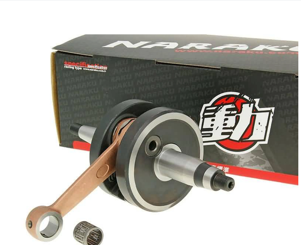 Högkvalitativt originalliknande vevparti till modeller med Derbi D50B0 motor. Detta vevparti från Naraku motsvarar originalvevpartiet i storlek och utförande. Det är ett perfekt alternativ istället för ett dyrt originalvevparti. Levereras med nållager. Tänk dock på att även byta till nya ramlager när du byter vevparti.